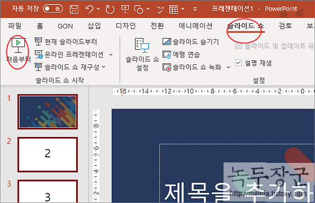 ▼ 이제 설정한 자동 전환 슬라이드가 제대로 되는지 테스트합니다. F5 단축키를 클릭하거나 슬라이드 쇼 탭 > 처음부터 리본 메뉴를 클릭해서 쇼를 시작합니다.