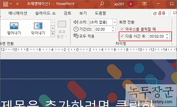 ▼ 마우스 클릭이 아닌 슬라이드를 자동으로 넘기기 위해 "다음 시간 후" 옵션을 체크한 후 바로 옆에 있는 시간 값을 입력합니다.