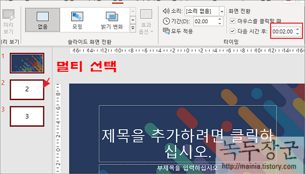 ▼ 여러개의 특정 슬라이드만 자동 전환을 적용하고 싶다면 마우스를 이용해서 왼쪽 슬라이드를 지정하고 옵션을 변경합니다.