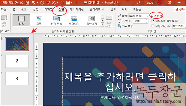 프레젠테이션을 하기 위한 가장 기본적인 기능인 화면 전환에서 자동 전환 방법이 있습니다. 보통 PT 를 위해 슬라이드 쇼를 실행하게 되면 마우스 클릭으로 화면을 전환하게 됩니다. 마우스 클릭이 아닌 시간이 경과하면 자동으로 화면 전환하는 방법을 알아보겠습니다.