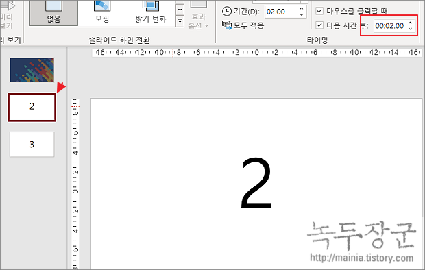 ▼ 다른 슬라이드를 선택해서 "다음 시간 후" 의 값이 적용되었는지 확인합니다.