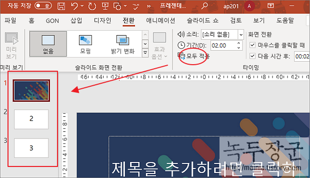 ▼ 선택한 하나의 슬라이드 외에 나머지에도 설정한 자동 전환을 적용하고 싶다면 모두 적용 버튼을 클릭합니다.