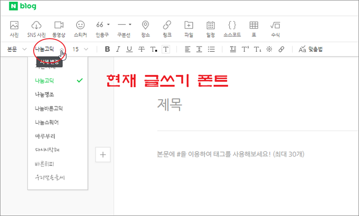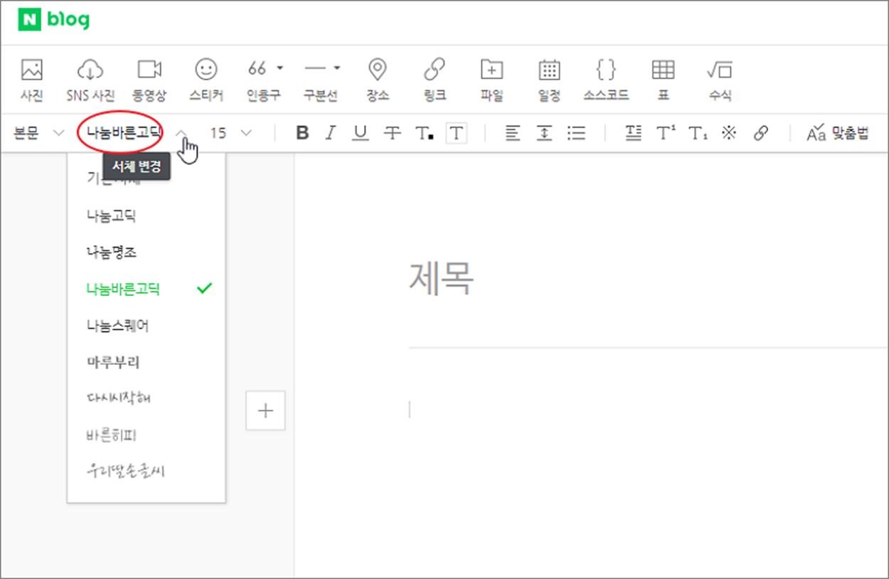 ▼ 이제 블로그 글쓰기 화면으로 이동합니다. 서체가 이전 나눔 고딕 -> 나눔바른고딕 으로 변경된 것을 확인할 수 있습니다.