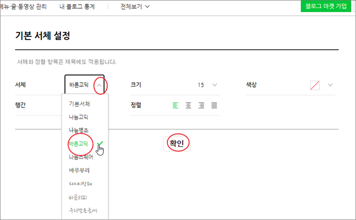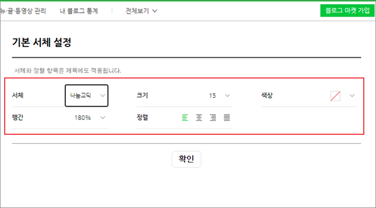 ▼ 기본 서체 설정은 블로그 글쓰기 화면을 열었을 때 기본으로 선택되는 서체 관련 옵션들을 설정하는 곳입니다. 서체(폰트), 폰트 크기, 색상 등 서식관련 옵션들입니다.