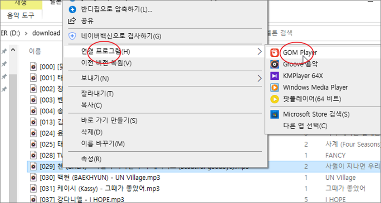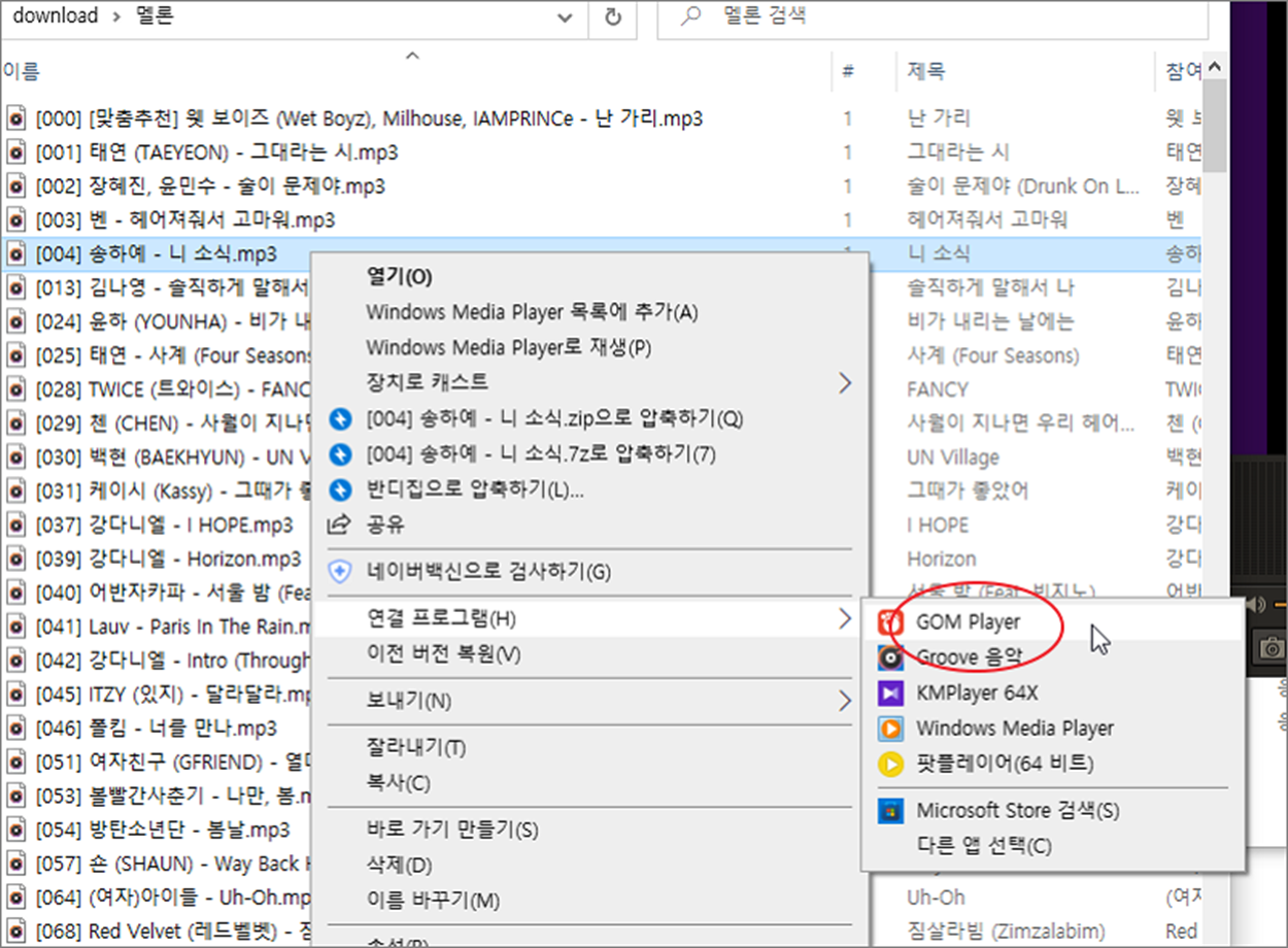 ▼ 그림처럼 영상이나 음원을 실행해 봅니다. 오른쪽 마우스 > 연결 프로그램 > GOM Player 를 선택합니다. 이전에 실행되어 있는 곰플레이어가 있다면 해당 창에 선택한 파일이 연결됩니다.