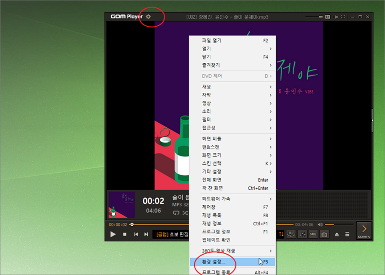 ▼ 서두에서 이야기했듯이 새로운 곰플레이어 창을 띄워서 영상을 보거나 음원을 듣고 싶다면 설정에서 변경해야 합니다. 곰플레이어 창에서 F5 를 누르거나 화면 왼쪽 상단에 톱니바퀴 아이콘을 클릭해서 환경 설정 창을 띄웁니다. 다음 환경 설정 메뉴를 클릭합니다.