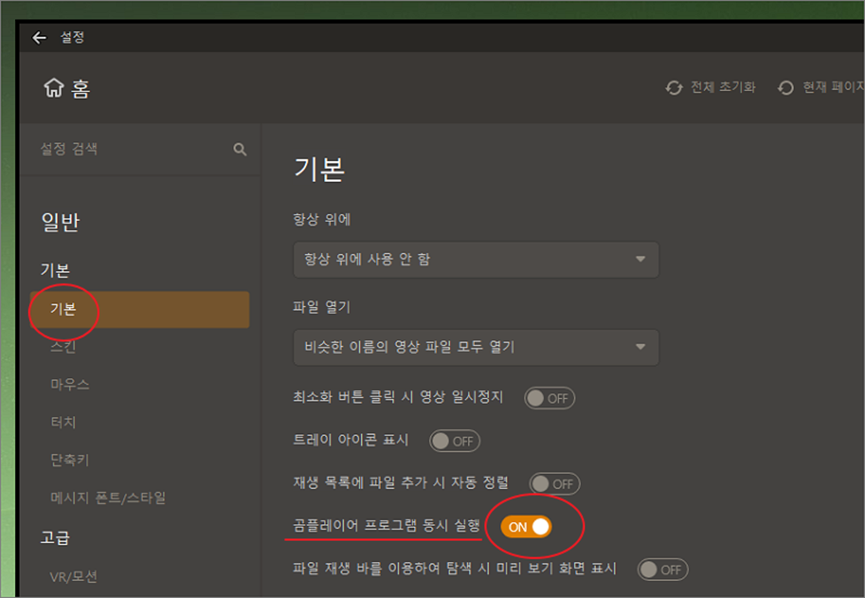 ▼ 설정 창에서 일반 > 기본 메뉴를 선택합니다. 오른쪽 설정 페이지 하단으로 내려가서 “곰플레이어 프로그램 동시 실행” 옵션을 ON -> OFF 로 변경합니다.
