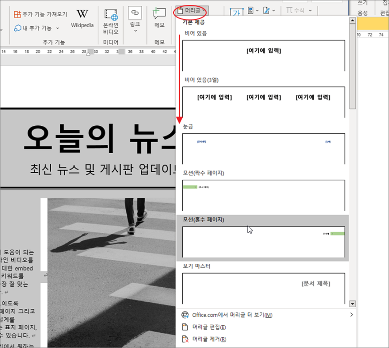 ▼ 삽입 탭 > 머리글 에는 선택 가능한 머리글 포맷들이 있습니다. 원하는 항목을 클릭해서 머리글 편집 화면으로 전환합니다.
