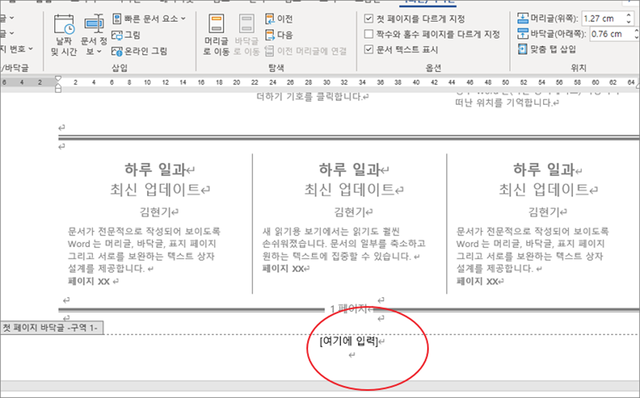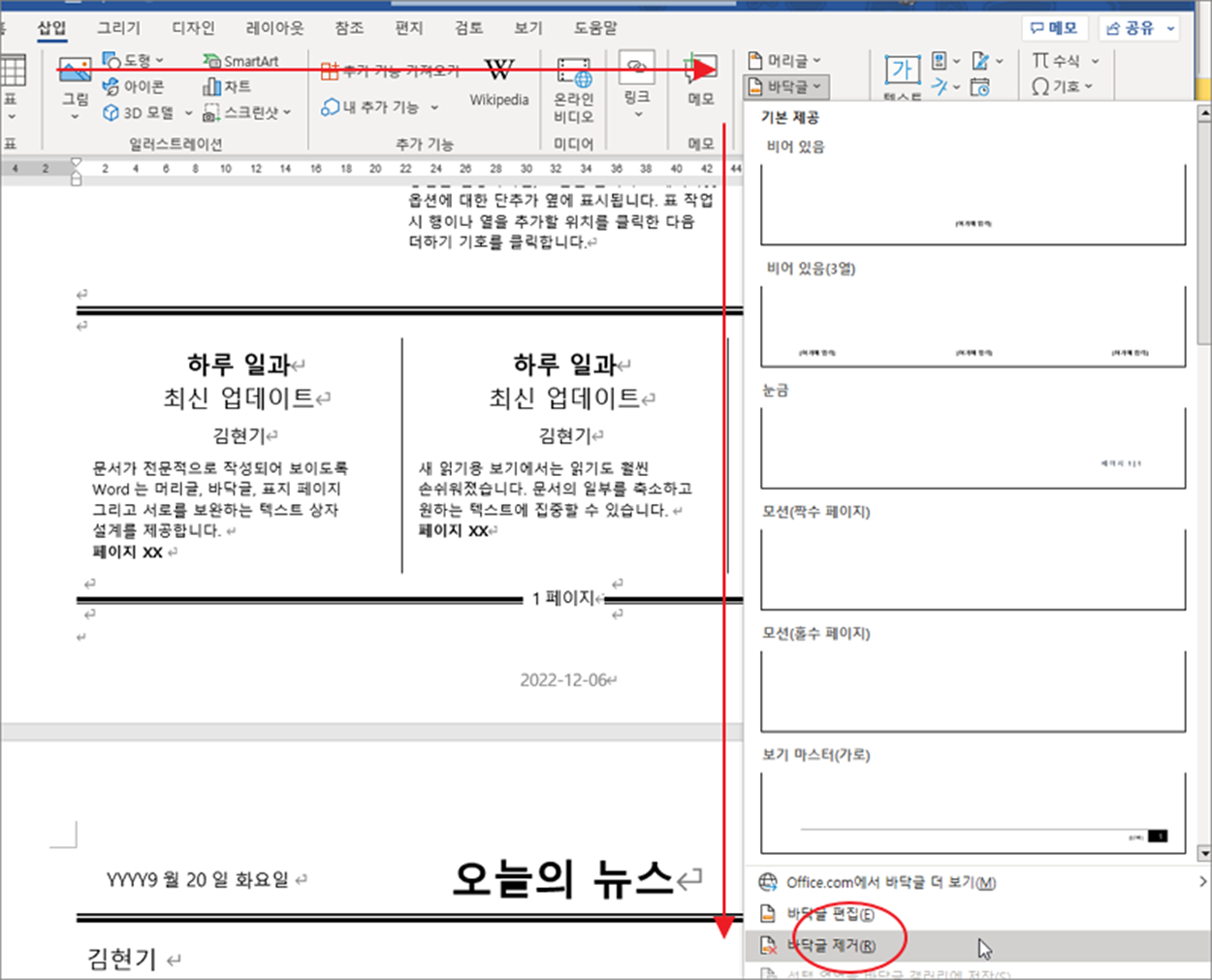 ▼ 바닥글 삭제도 간단합니다. 입력한 바닥글 전체를 바꾸고 싶다면 삽입 탭 > 바닥글 > 바닥글 제거 메뉴를 클릭합니다.