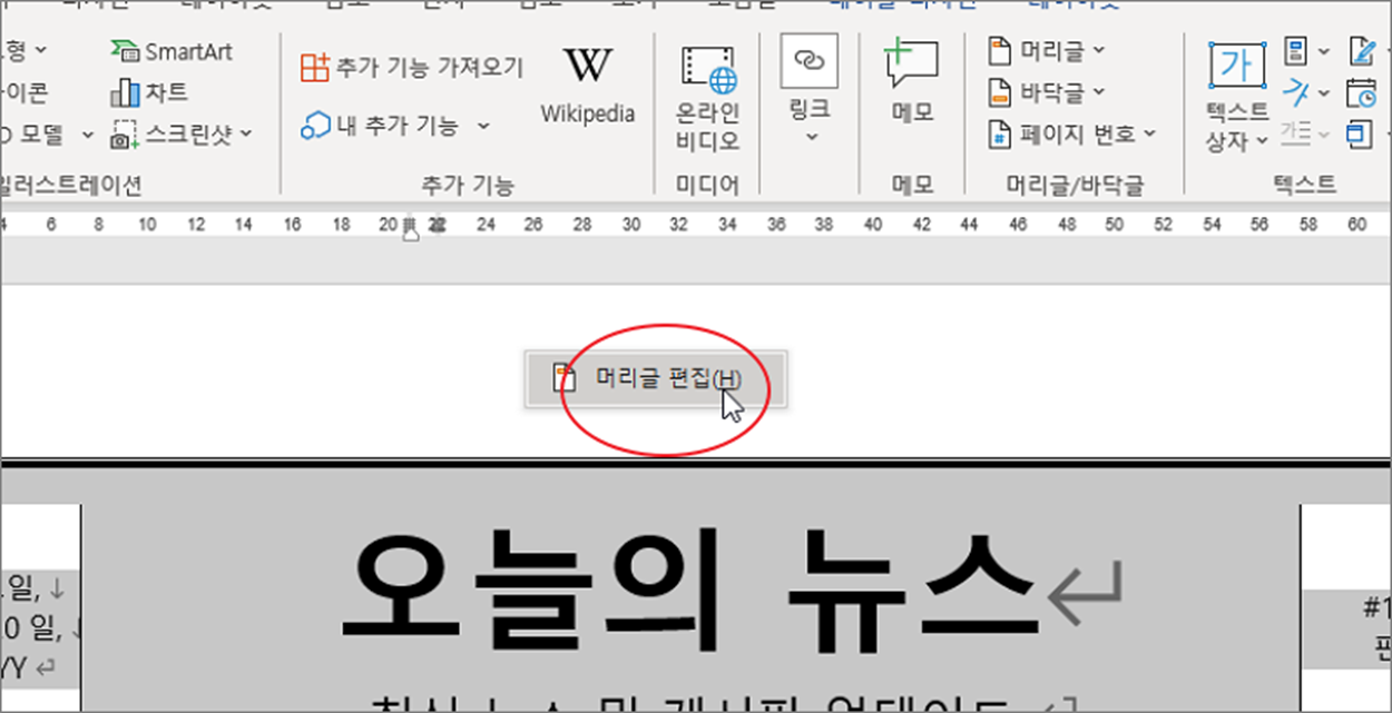 ▼ 또는 상단 여백에서 오른쪽 마우스를 클릭하면 뜨는 머리글 편집을 이용할 수도 있습니다.