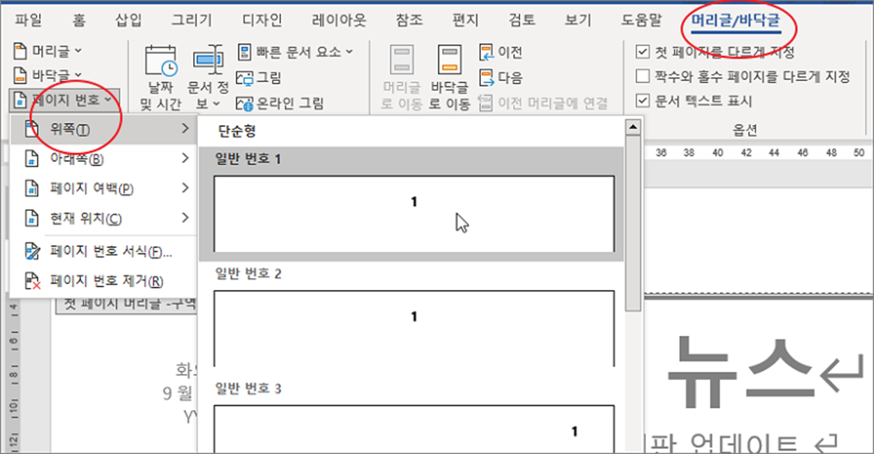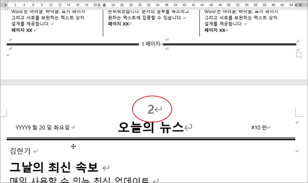 ▼ 머리글에 추가한 페이지 번호는 다음과 같습니다.