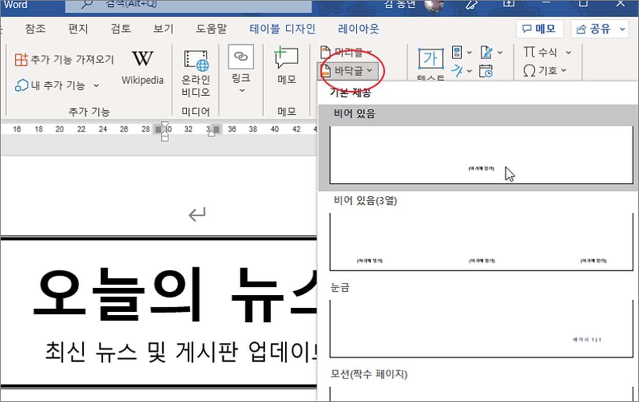▼ 다음은 바닥글을 추가해 보겠습니다. 머리글 추가하는 방식과 동일하게 삽입 탭 > 바닥글 메뉴를 이용합니다.