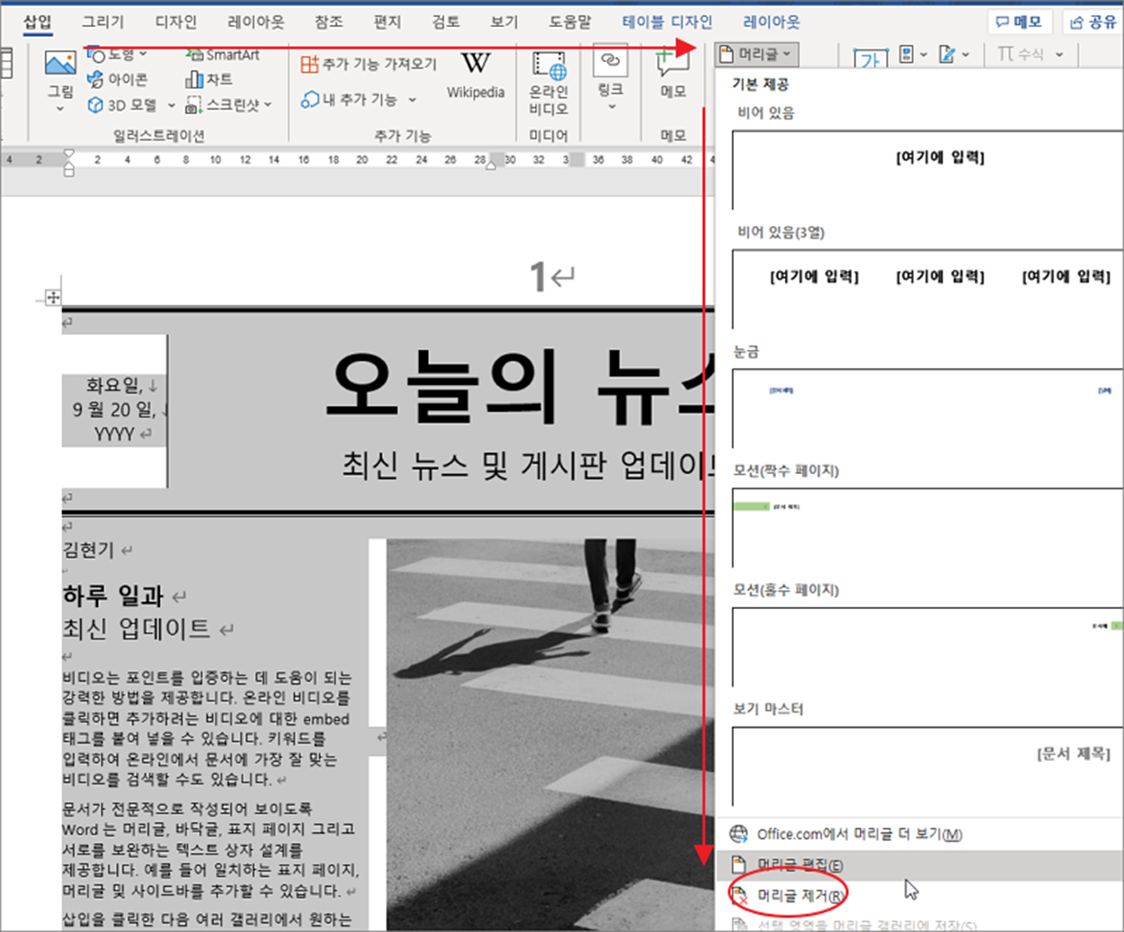▼ 이제 추가한 머리글을 삭제해 보겠습니다. 삭제하는 방법은 간단합니다. 삽입 탭 > 머리글 > 머리글 제거 메뉴를 클릭해서 추가한 머리글 전체를 삭제합니다.