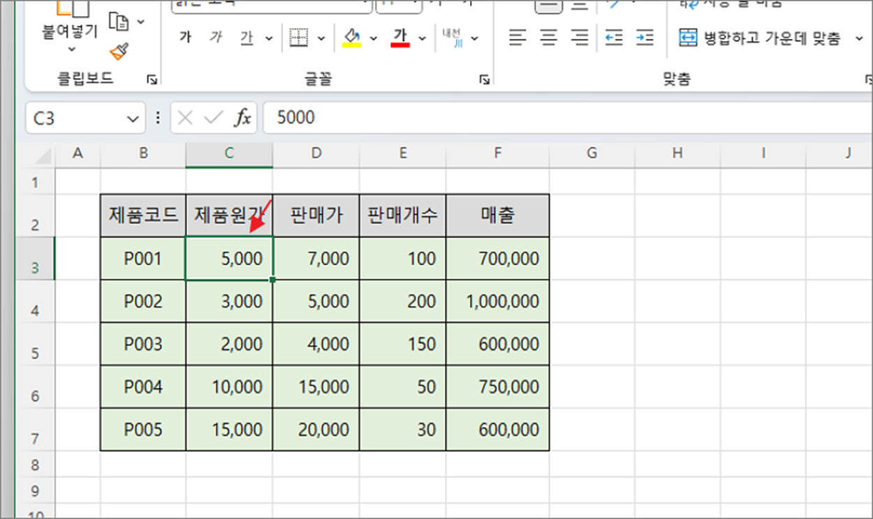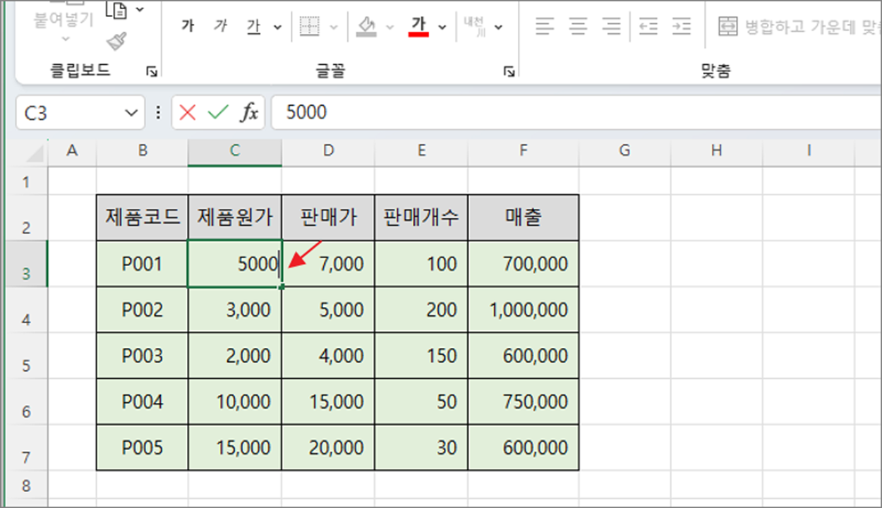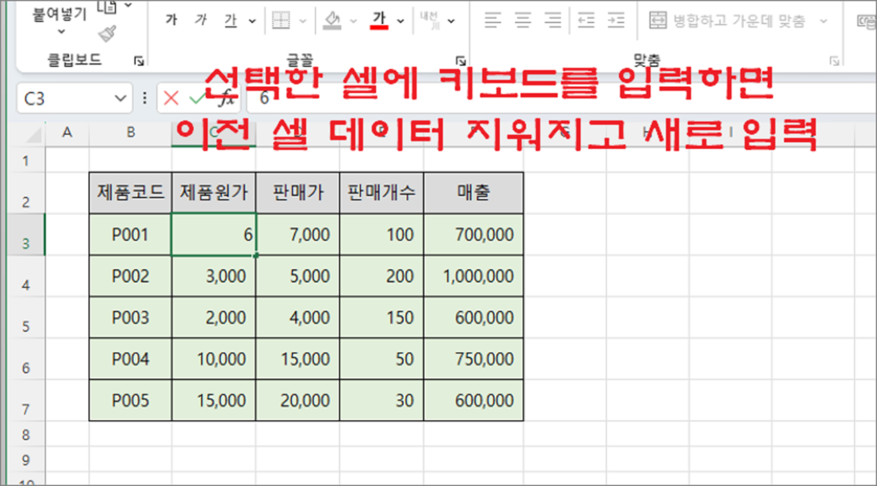 ▼ 다음 원하는 값을 키보드로 타이핑합니다. 그러면 셀에 있던 이전 값은 사라지고 새로운 값이 들어갑니다.