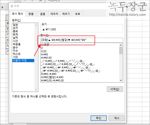 ▼ 다음은 표시 형식 > 사용자 지정 서식으로 이동합니다. 사용자 지정의 형식 란에 아래와 같이 입력합니다. 해석하자면 “;” 세미콜론으로 3가지 경우의 수를 구분해서 지정하고 있습니다. 세미콘론의 첫 번째 영역은 셀에서 계산된 값이 참일 때, 그러니까 양수일 때 적용할 형식입니다. "[파랑]▲\#,##0" 에서 [파랑]은 숫자 텍스트의 색상을 파란색으로 표시합니다. 다음 ▲ 기호가 표시됩니다. 두 번째 영역은 거짓일 때 적용됩니다. 그러니까 마이너스가 나오면 적용되며, 마지막은 값이 같을 때 입니다.