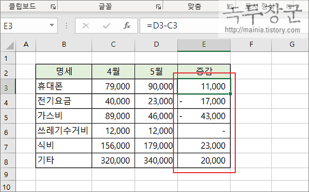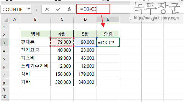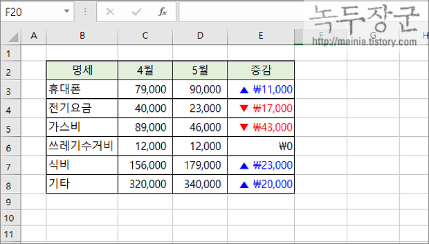 ▼ 엑셀에서 특수 문자인 세모 기호를 표시하기 위해 사용자 지정 형식을 사용할 것입니다. 아래 그림에서 가계부에 쓰인 데이터입니다. 4월과 5월 비용을 비교해서 증감을 표시할 것입니다. 마이너스이면 ▼ 기호를 표시하고 빨간색으로 표시할 것이며, 플러스인 경우 ▲ 와 파란색으로 표시합니다. 먼저 두 값의 차이를 구합니다.