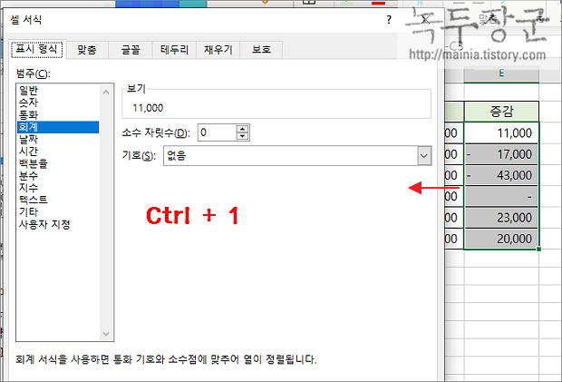▼ 양수와 음수를 판단해서 특수 기호인 ▼ ▲ 를 표시하기 위해 셀 서식을 띄우겠습니다. 단축키 Ctrl + 1 을 눌러 셀 서식 대화상자를 띄웁니다.