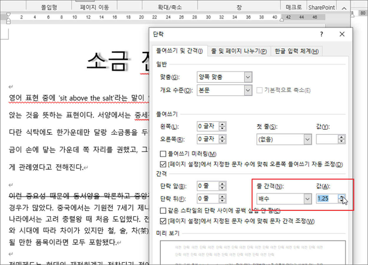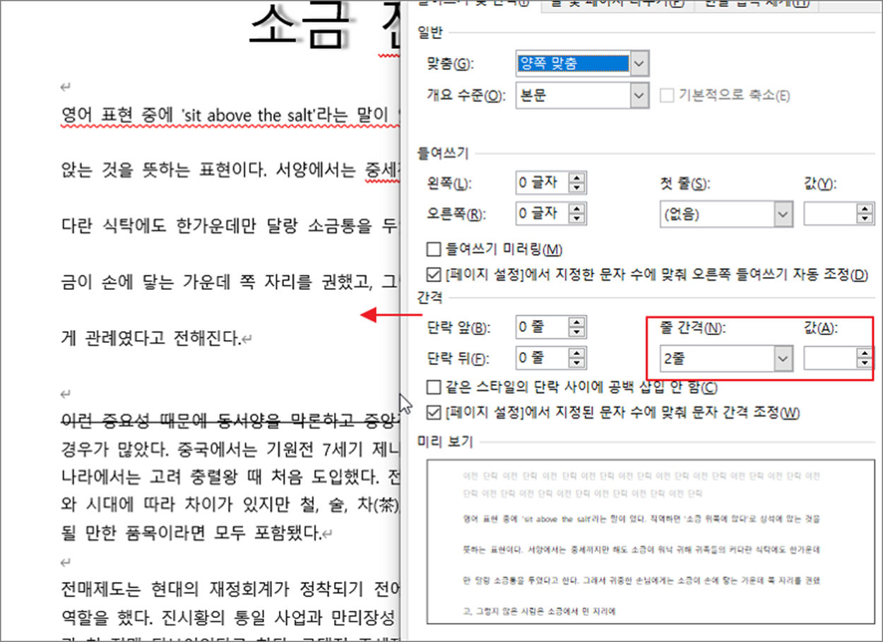 ▼ 다음은 단락 간 간격입니다. 위 아래 단락 간 간격도 단락 설정창을 통해서 조절합니다. 기본 단락 간 간격은 0 줄 입니다. 단락 뒤 값을 입력하고 확인 버튼을 눌러 적용해 보세요.