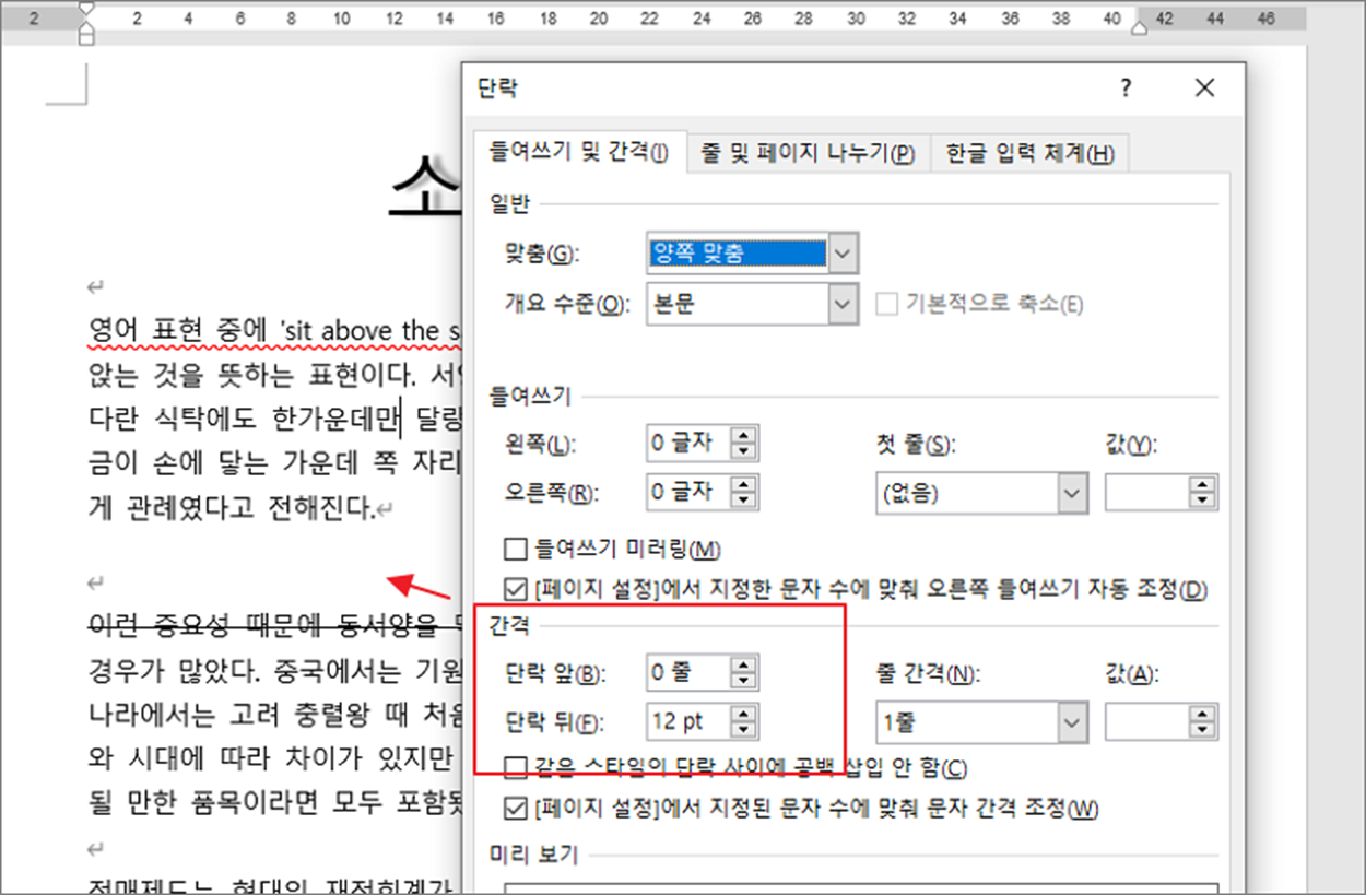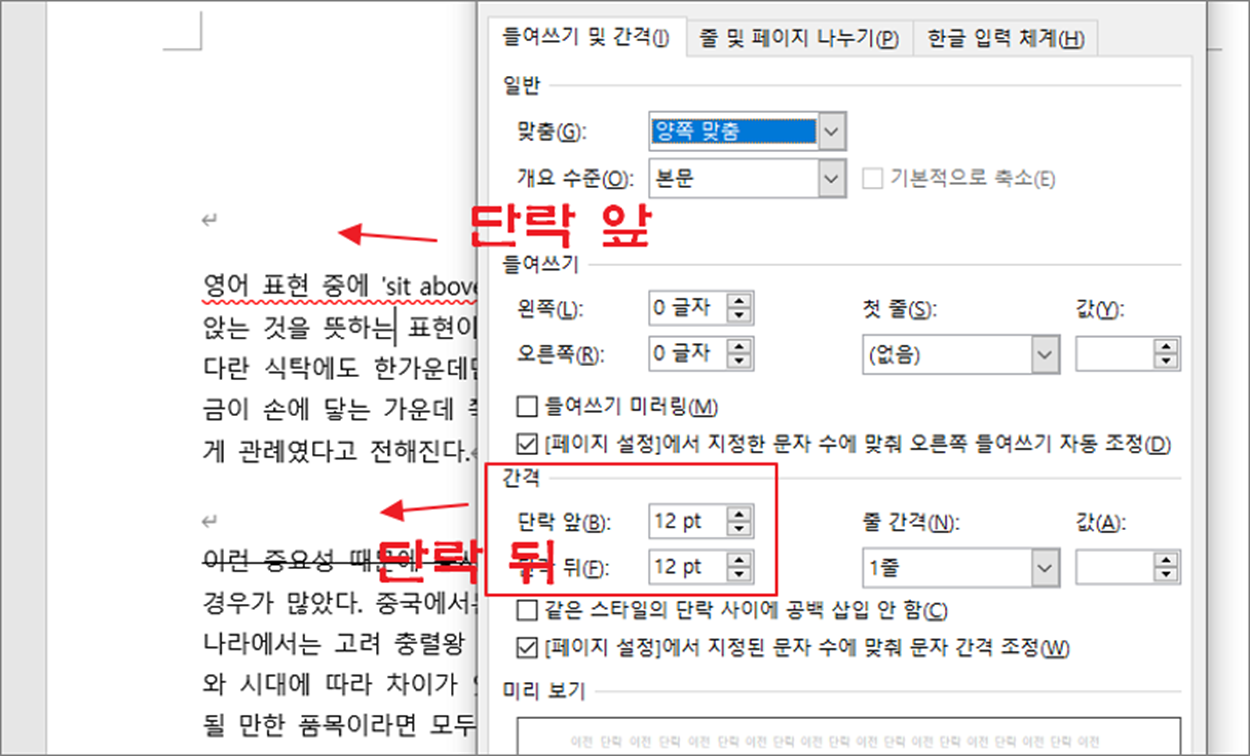 ▼ 아래 그림은 단락 앞 뒤에 1줄씩 띄운 결과 입니다. 참고로 1줄은 12pt 를 뜻합니다.
