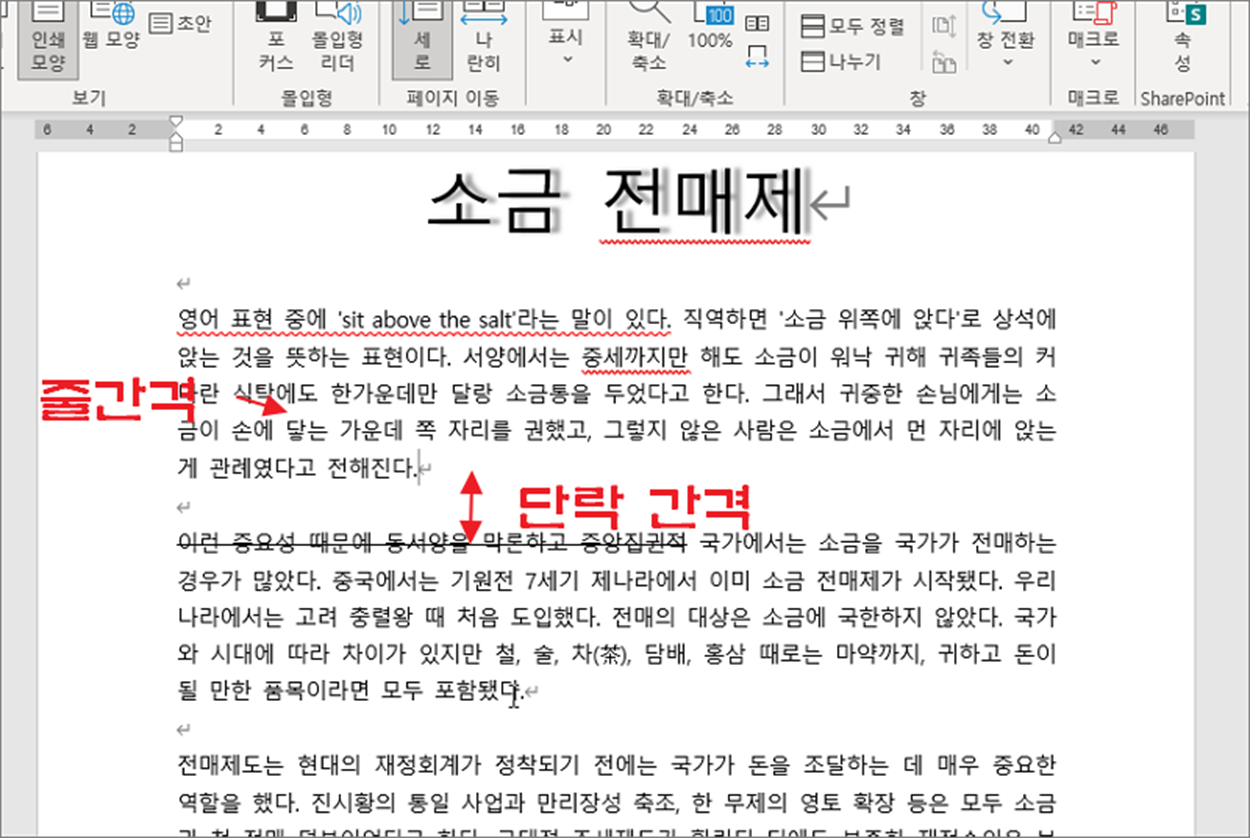 워드에서는 엔터(Enter) 로 글 단위 단락을 구분합니다. Enter 로 구분하는 두 단락 사이의 간격을 “단락 간격” 이라고 합니다. 줄 간격은 단락 내부의 줄 간 간격을 말합니다. 단락은 앞 뒤 간격이 있지만 줄 간격은 하나입니다. 어떻게 조절하는지 하나씩 알아보겠습니다.