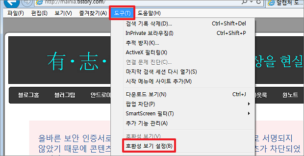 ▼ 간단한 방법은 호환성 보기에서 표시할 웹 사이트를 추가하는 것입니다. 상단에 도구 메뉴를 클릭한 뒤 [호환성 보기 설정] 메뉴를 선택합니다.