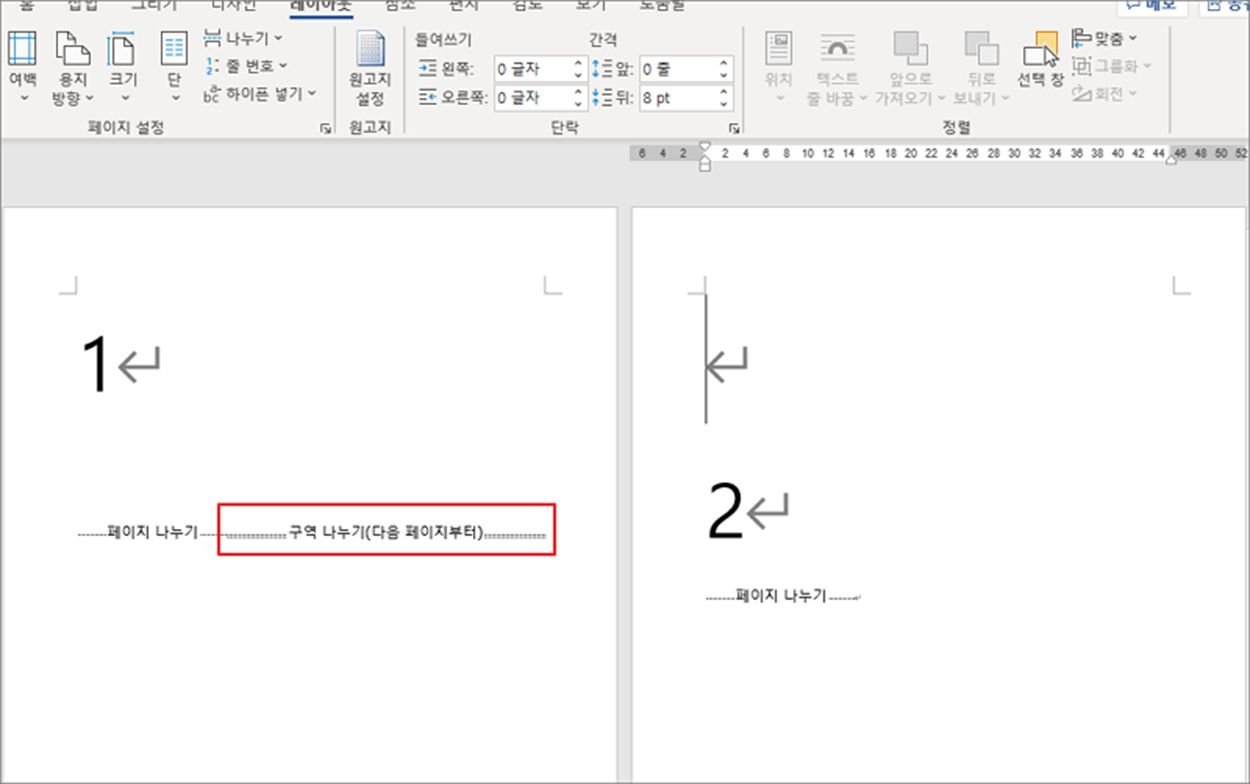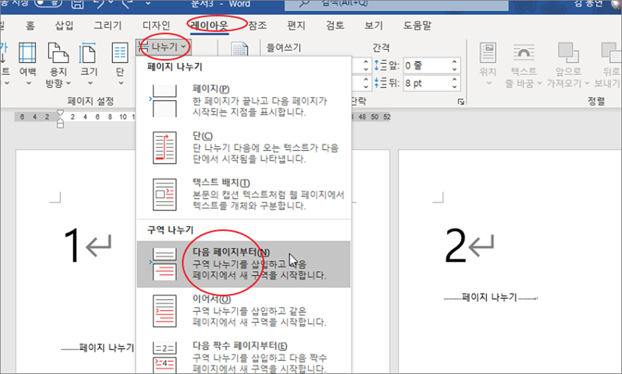▼ 2페이지 끝에 커서를 두고 레이아웃 > 나누기 > 구역 나누기 > 다음 페이지부터 메뉴를 선택합니다.
