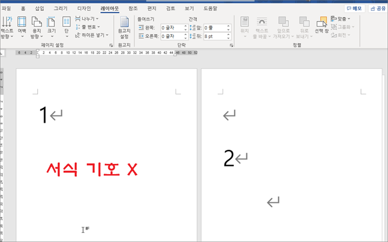 ▼ 위에서 언급했지만 페이지별 용지 방향을 따로 적용하기 위해서는 구역 나누기로 페이지를 구분해야 합니다. 구역 나누기가 적용되었는지 확인하기 위해서는 서식 기호를 화면에 표시하는 것이 좋습니다.