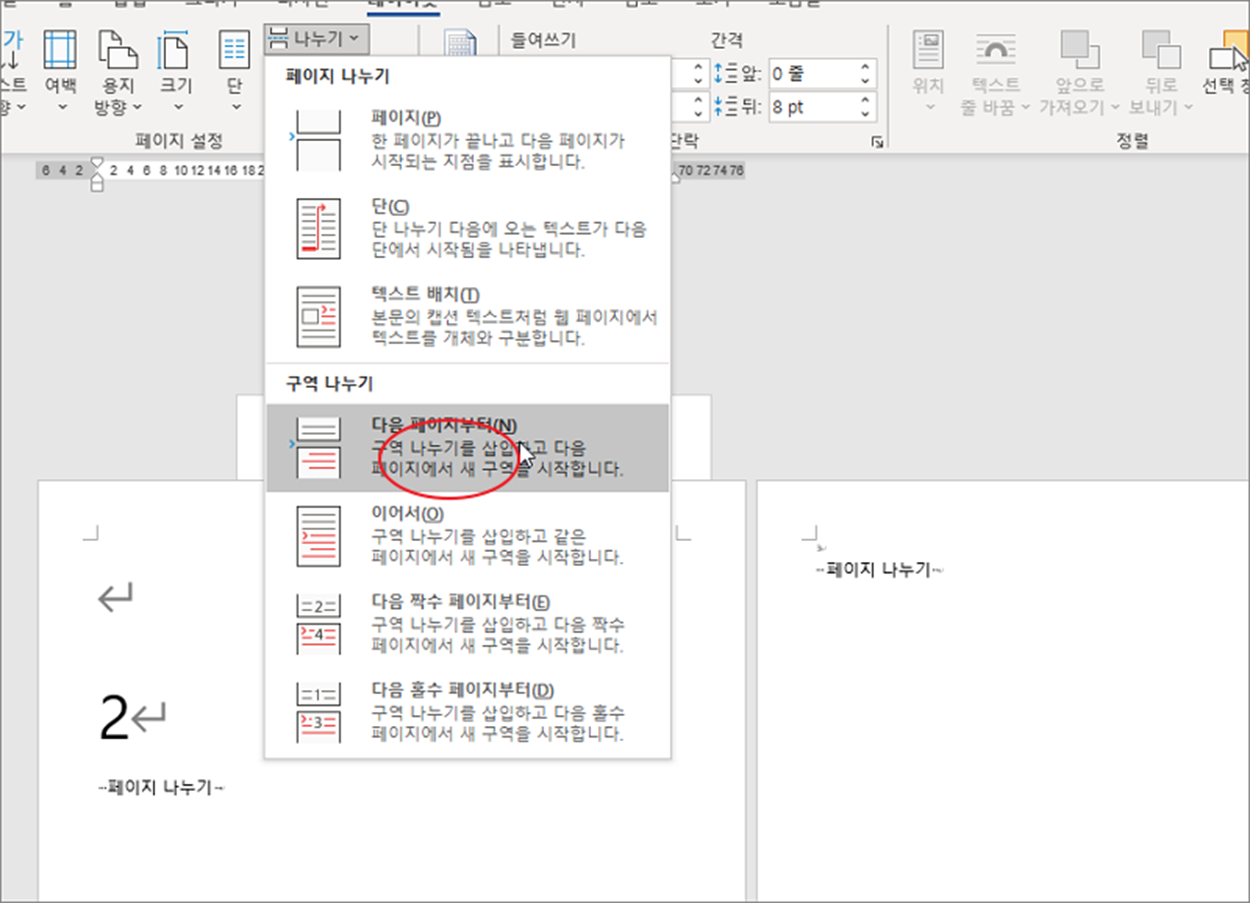 ▼ 다음 레이아웃 > 나누기 > 구역 나누기 > 다음 페이지부터 메뉴를 선택합니다.