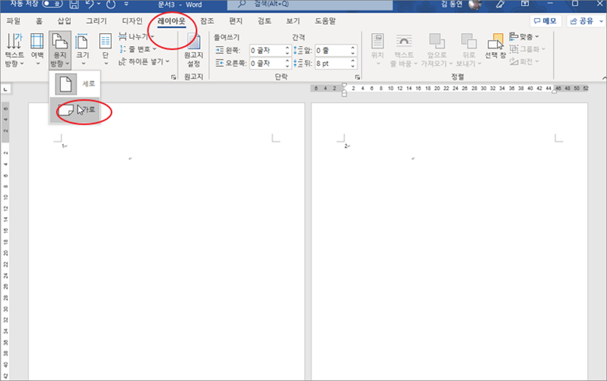 ▼ 특정 페이지에 커서를 두고 용지 방향을 바꿔보겠습니다. 레이아웃 > 용지 방향 > 가로 로 변경해 보세요.