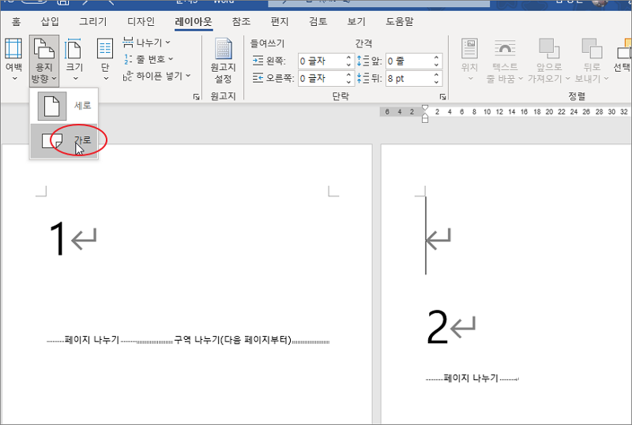 ▼ 커서를 2페이지에 두고 용지 방향을 바꾸기 위해 레이아웃 > 용지 방향 > 가로 메뉴를 선택합니다.
