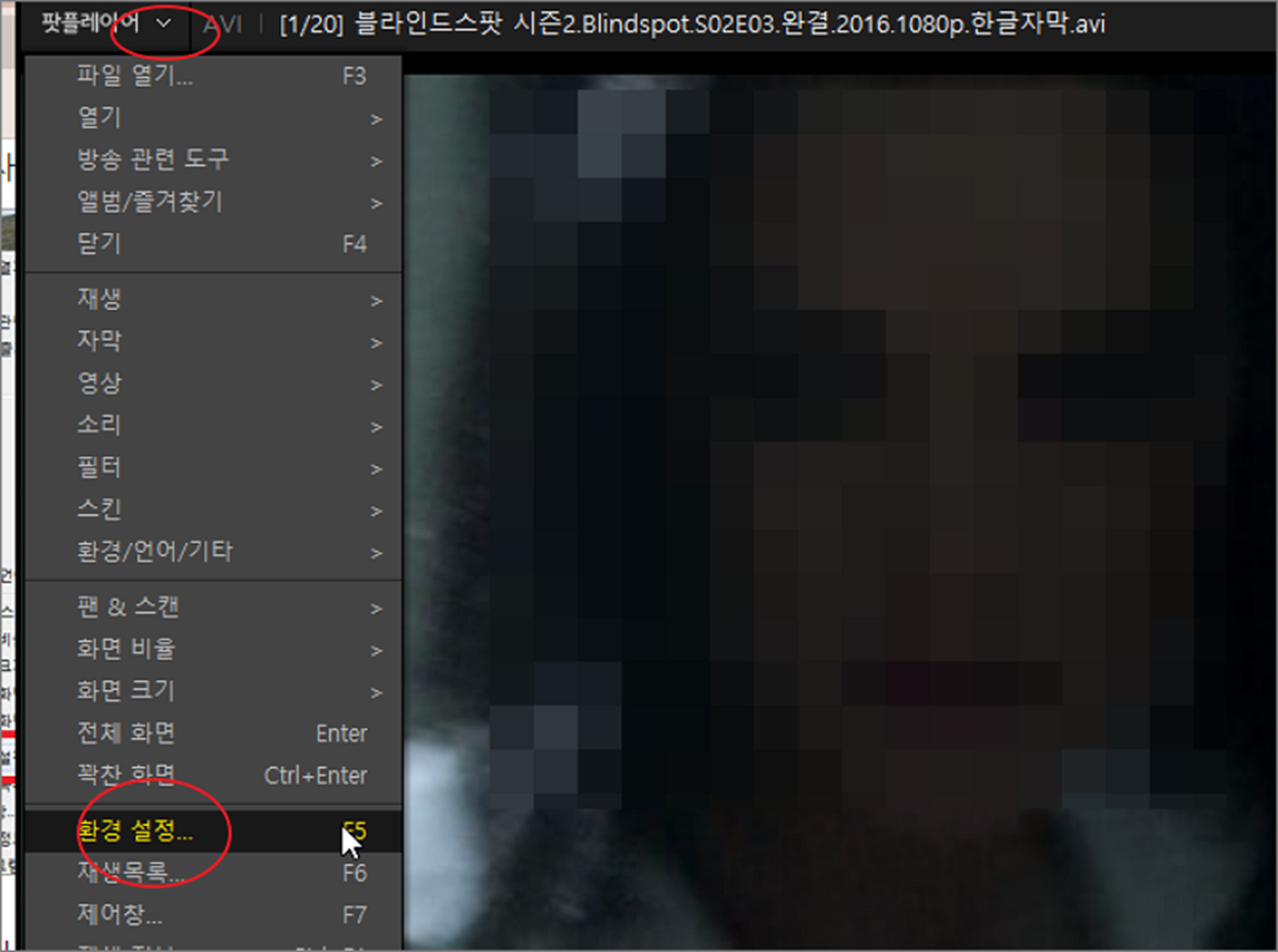 ▼ 설정을 바꾸고 싶다면 F5 를 누르거나 오른 마우스를 눌러 단축 메뉴에서 [환경 설정] 을 선택합니다. 곰플레이어와 메뉴 구조는 유사합니다.