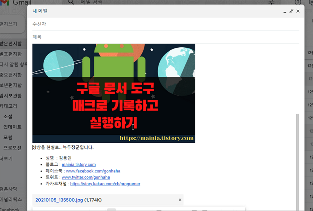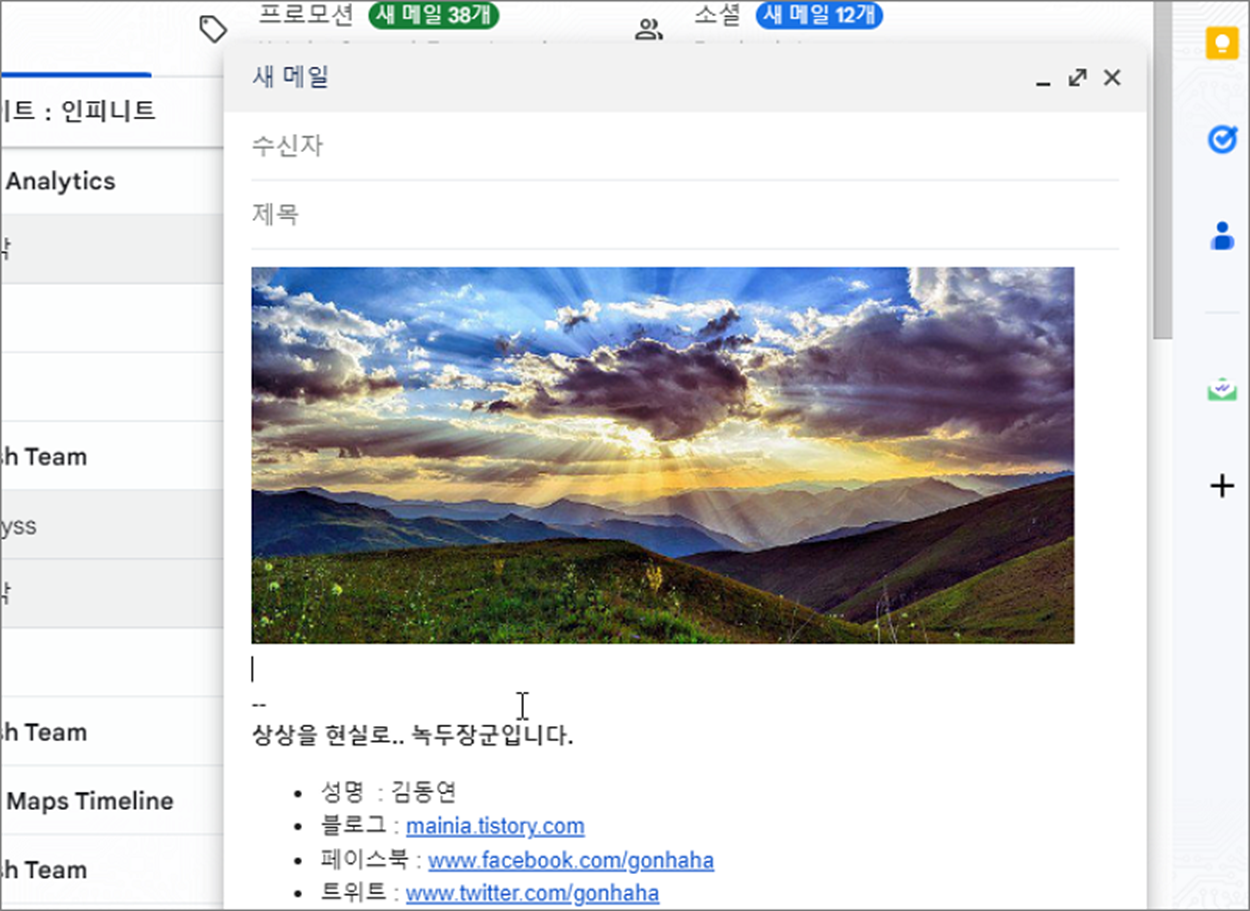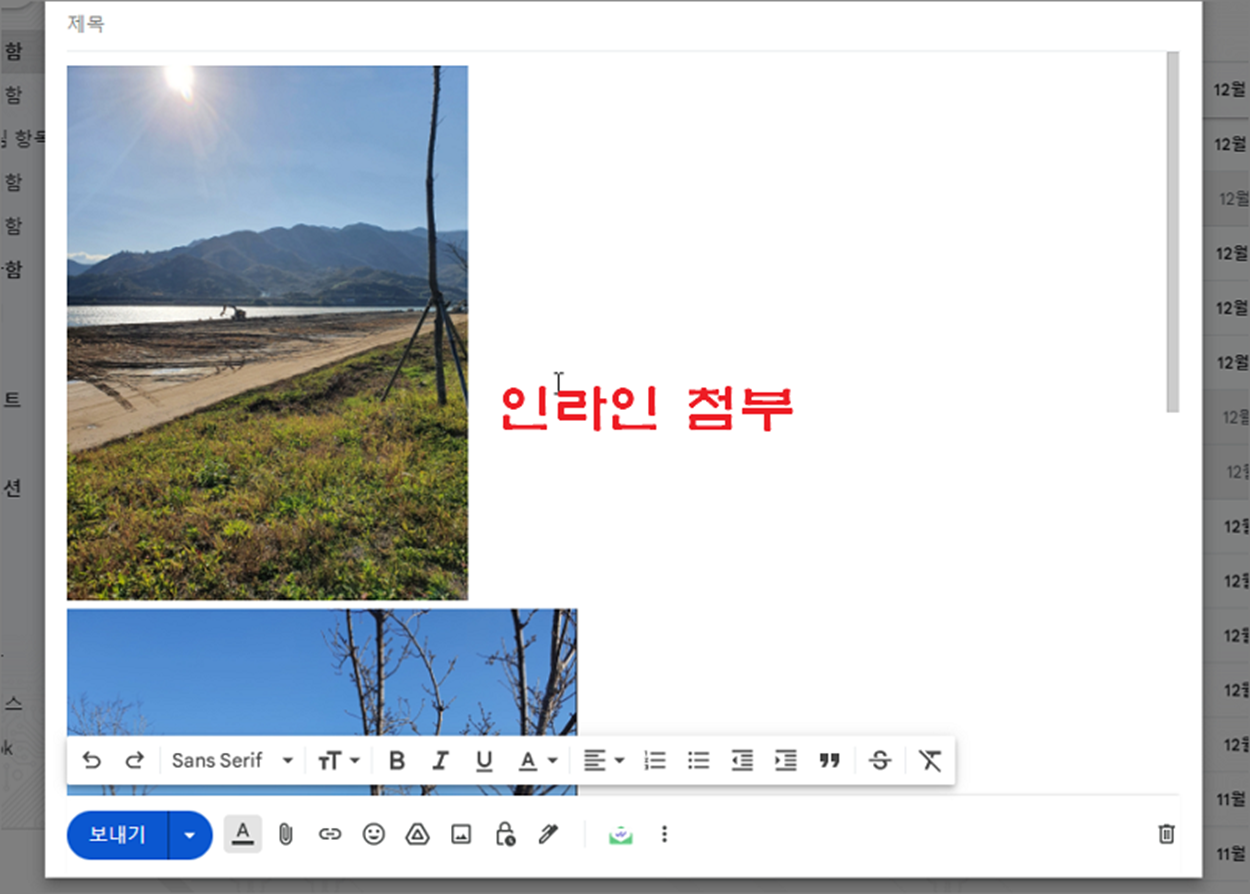 ▼ 그림처럼 드래그해서 추가한 이미지는 메일 본문에 인라인 방식으로 첨부가 됩니다.