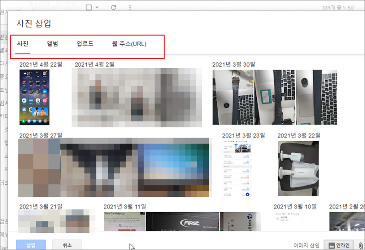 ▼ 사진 삽입 창에는 4개의 탭이 있습니다. 이미지를 추가하는 4 가지 방식입니다. 사진, 앨범 탭은 구글 포토에 올라가 있는 사진을 보여줍니다. 스마트폰에서 올린 사진들이 대부분이겠죠. 업로드 탭은 PC 의 사진이나 이미지를 추가하는 방식입니다. 마지막 웹 주소는 웹 페이지의 이미지 링크 주소를 입력해서 메일에 첨부할 수 있는 방식을 말합니다.