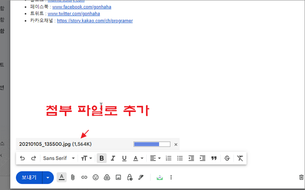 ▼ 인라인을 선택한 경우 아래 그림과 같이 메일 본문에 들어 갑니다.