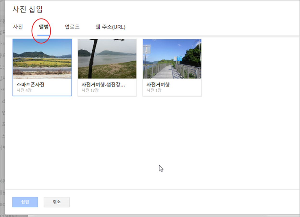 ▼ 다음은 앨범 입니다. 앨범은 구글 포토에 만들어 놓은 앨범 목록이 나타납니다. 사진 탭에서 이미지를 추가했던 것과 동일한 방식으로 메일 본문에 첨부할 수 있습니다.