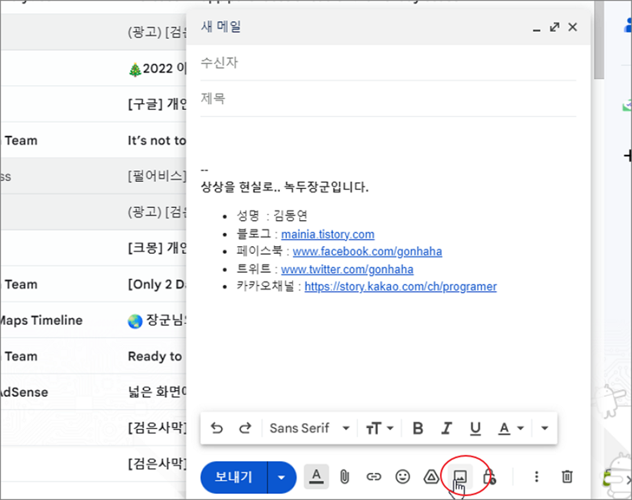 ▼ 메일 화면 오른쪽 하단에 새 메일 팝업창이 뜨면 이미지 추가 버튼을 클릭합니다.