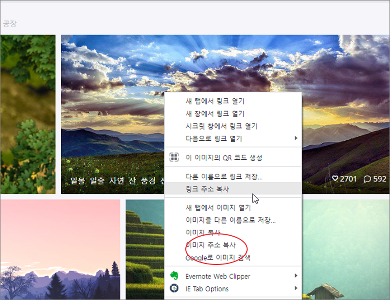 ▼ 마지막으로 웹 주소(URL) 로 추가하는 방법입니다. 웹 주소 방식을 이용하려면 이미지의 주소 URL 이 필요합니다. 보통 웹 페이지에서 첨부하고 싶은 이미지가 있는 경우 오른쪽 마우스 > 이미지 주소 복사 메뉴로 클립보드에 URL 을 복사합니다.