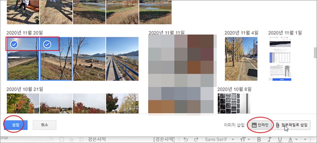 ▼ 먼저 사진 탭을 이용해 보겠습니다. 구글 포토에 올라가 있는 사진이 화면에 날짜순으로 나타납니다. 첨부하고 싶은 이미지를 선택하고 인라인 또는 첨부파일로 삽입 중 하나를 선택하고 삽입 버튼을 클릭합니다.