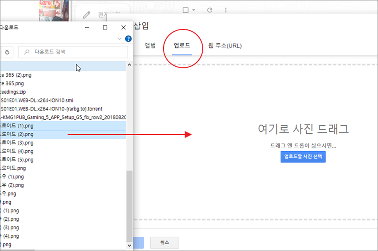 ▼ 다음은 업로드 탭입니다. PC 의 이미지를 추가할 때 이용하는 방식입니다. 파란색 점선 영역에 사진을 드래그해서 넣거나 [업로드할 사진 선택] 버튼을 클릭해서 추가합니다.