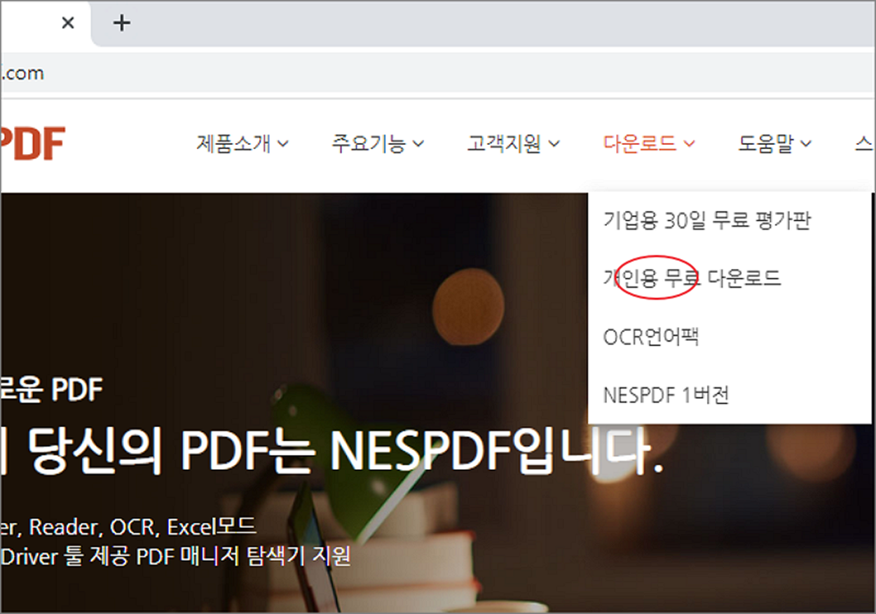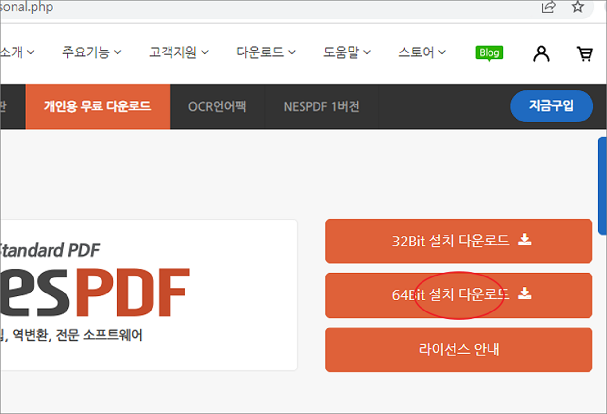 ▼ 먼저 NesPDF 프로그램을 다운 받기 위해 아래 사이트로 이동합니다. 사이트에 접속해서 상단 메뉴 다운로드 > 개인용 무료 다운로드 를 클릭합니다. 개인용은 무료이며, 기업용은 30일 무료 평가판입니다.