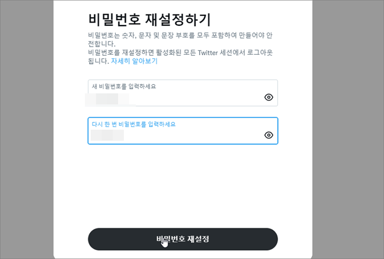 ▼ 비밀번호 재설정을 위한 페이지로 이동하면 새 비밀번호와 확인 비밀번호를 입력합니다. 입력이 끝나면 화면 하단에 비밀번호 재설정 버튼을 클릭해서 완료합니다.