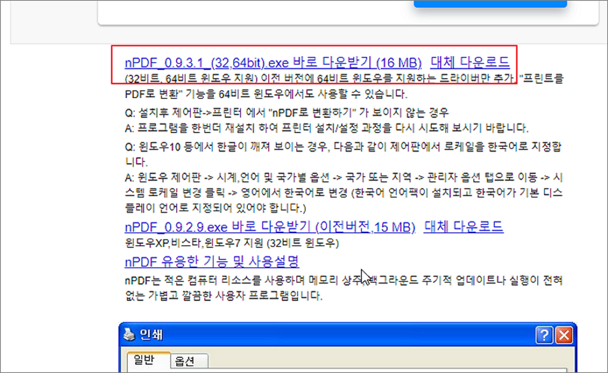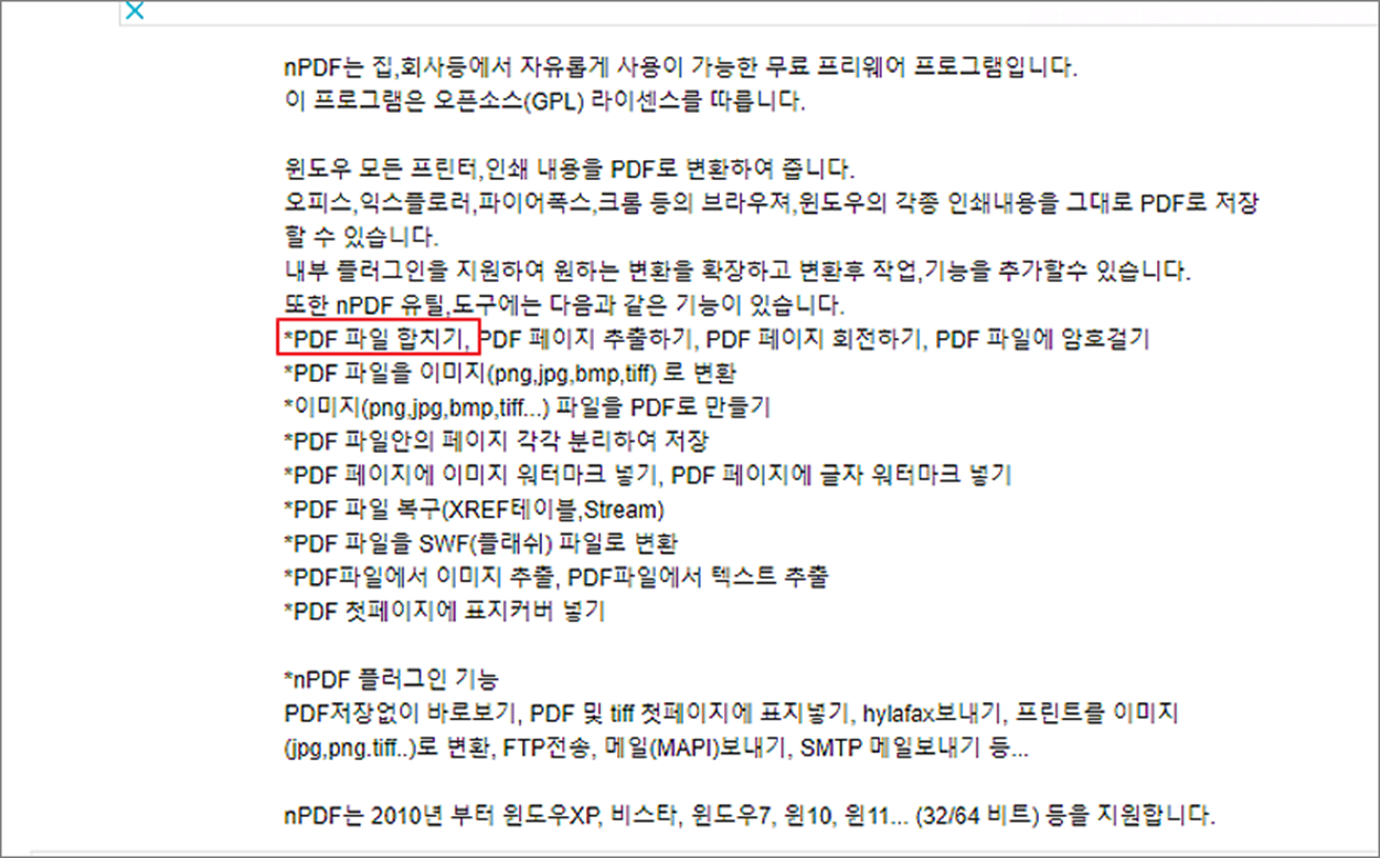 nPDF 는 PDF 파일을 다룰 때 유용한 프로그램입니다. 몇 년 전에 나왔던 프로그램이라 업데이트는 안되고 있습니다. 그래서 64비트용은 별도로 제작 배포하지 않는 것 같습니다. 그런데 64비트 컴퓨터에서도 이상없이 작동합니다. 설치할 때 32비트용 이라고 뜨는데, 무시하고 설치하세요. nPDF 유틸의 유용한 기능 중 하나는 여러 부분으로 나누어진 파일을 하나의 파일로 합치는 기능입니다. 그리고 이미지 추출하기, 텍스트 추출하기 등 다양한 기능들이 있습니다. 이 중 pdf 파일을 합치는 기능은 여러 사람이 pdf 문서를 별도로 작업한 경우 하나로 합쳐서 완성된 파일을 만들 때 사용하면 좋습니다.