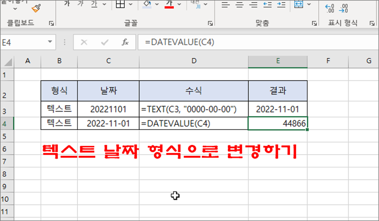 ▼ 다시 날짜 텍스트를 날짜 형식으로 변경합니다. 사용할 함수는 DATEVALUE 입니다. 텍스트 형태의 날짜를 숫자로 변환합니다. DATEVALUE 로 추출한 값은 날짜를 숫자로 표현한 것입니다.