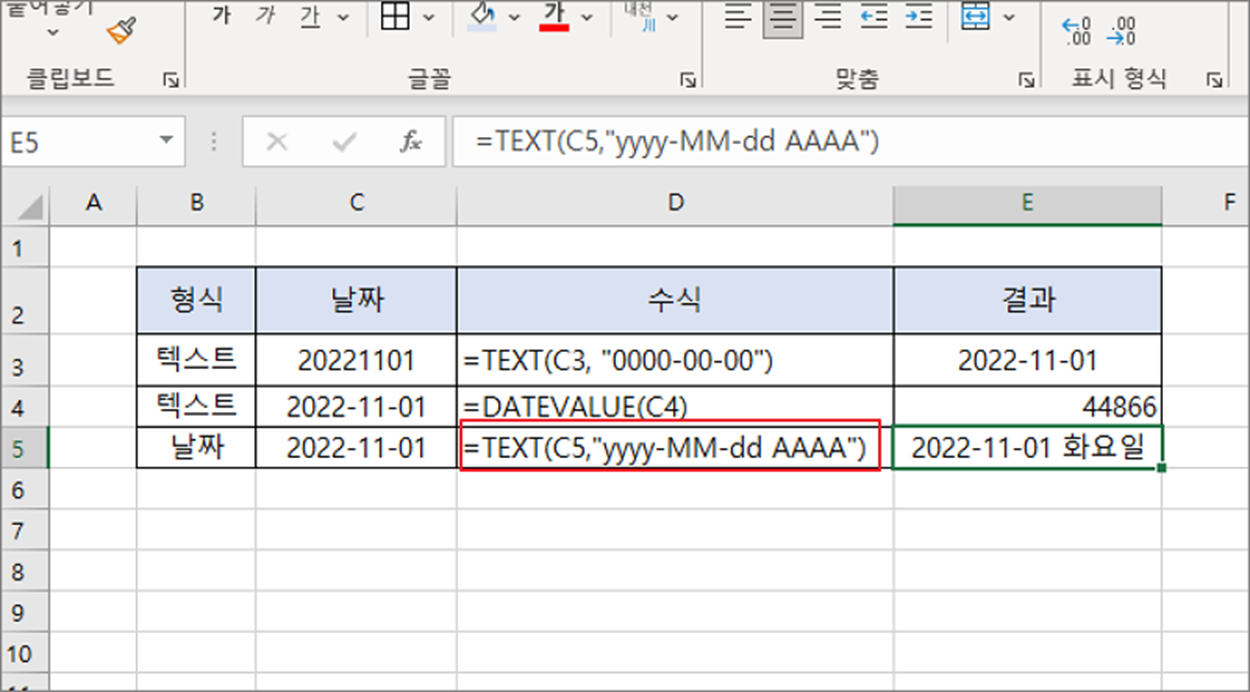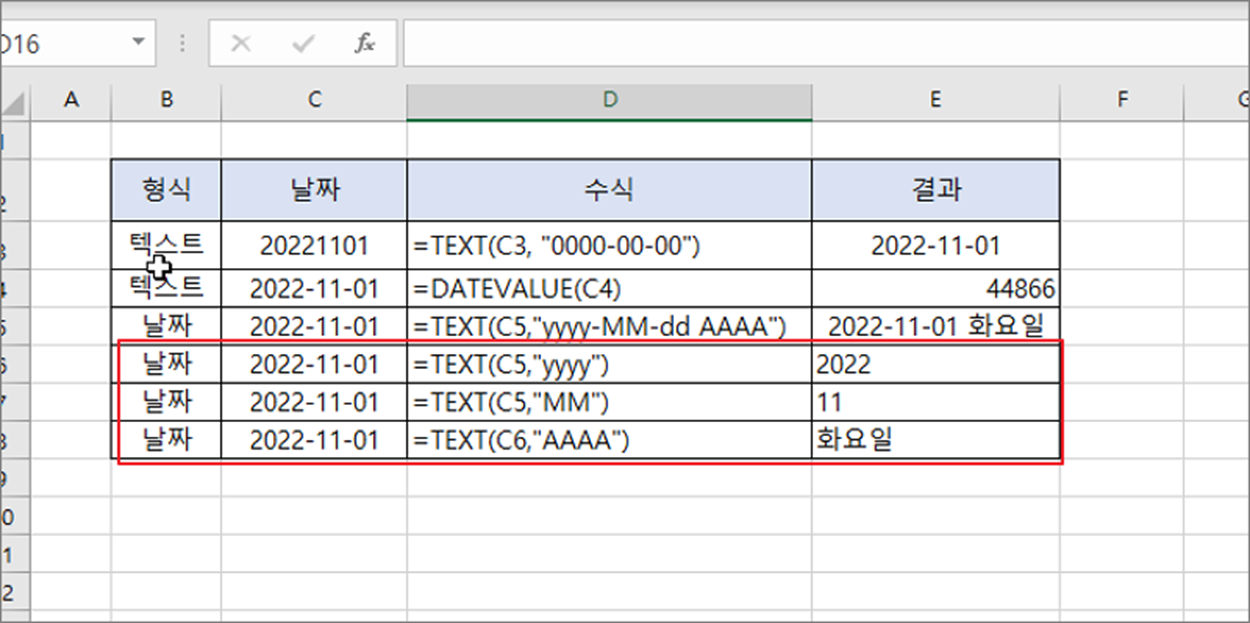 ▼ 월, 일, 년도, 요일도 바로 구할 수 있습니다. 날짜로 입력한 값이 텍스트인데 함수를 이용해서 다양한 형태로 변경하고 싶다면 제일 먼저 날짜 형식으로 변경해야 합니다. 날짜 형식 변경을 위해 사용할 DATEVALUE 함수는 인수로 반드시 날짜 형식을 갖춘 텍스트만 가능합니다.