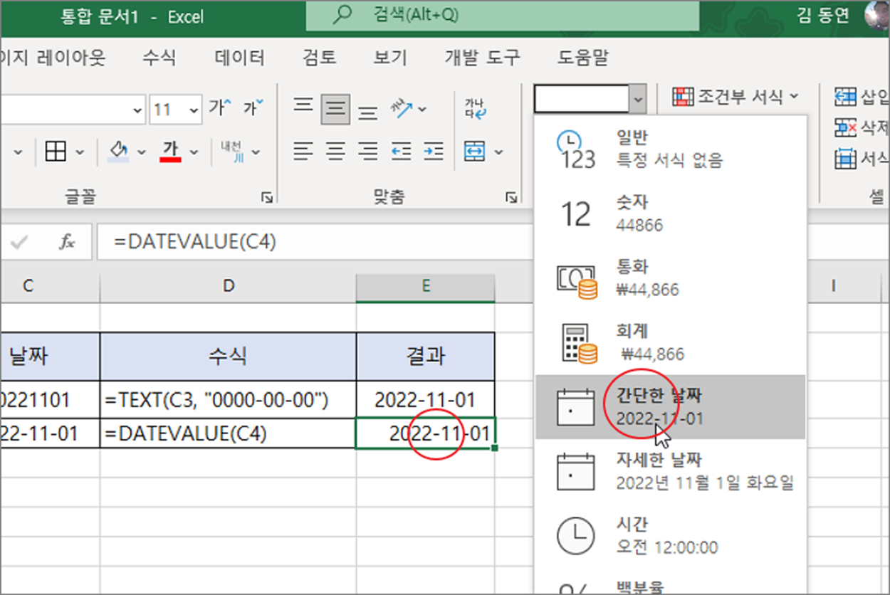 ▼ 숫자는 바로 날짜 형태로 변환이 가능합니다. 형태만 숫자이고 날짜 형식으로 변환이 가능한 값입니다. 20220129 을 날짜 형식으로 변경하기 위해 두 단계를 거친 이유는 DATEVALUE 함수를 이용해서 바로 변환할 수 없기 때문입니다.