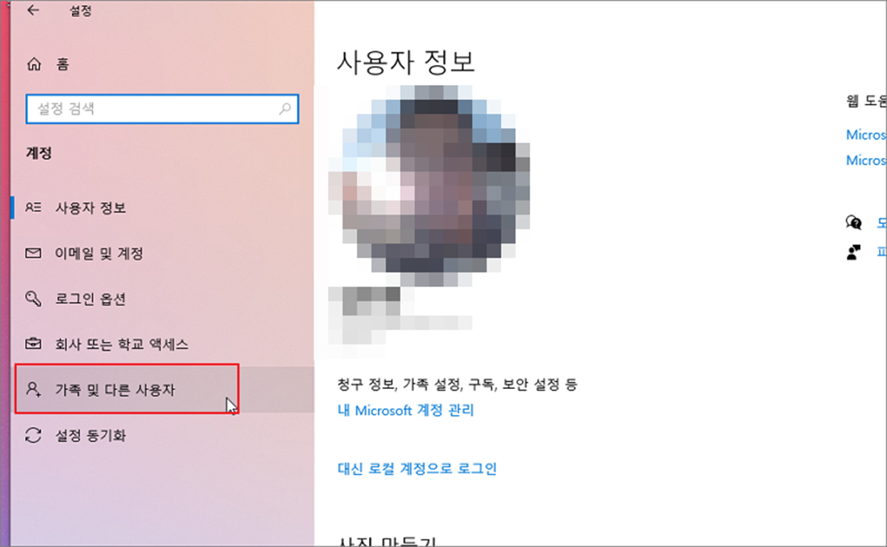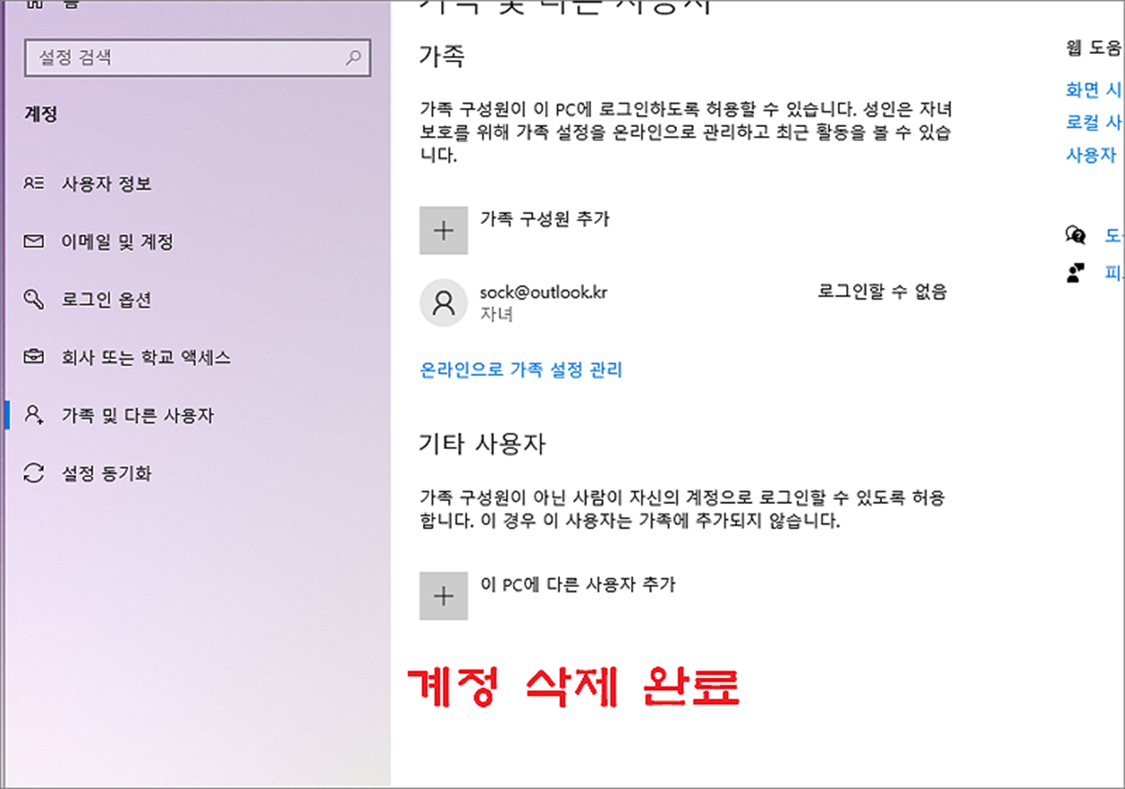 ▼ 계정 화면에서 왼쪽 사이드에 가족 및 다른 사용자 메뉴를 선택합니다. 이곳에 추가 계정이 있습니다.