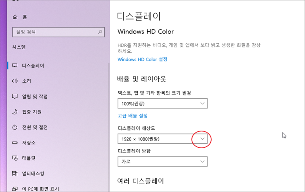 ▼ 윈도우의 화면 해상도를 변경하는 옵션이 디스플레이 해상도 입니다. 해상도를 변경하고 싶다면 오른쪽 끝에 화살표를 클릭합니다.