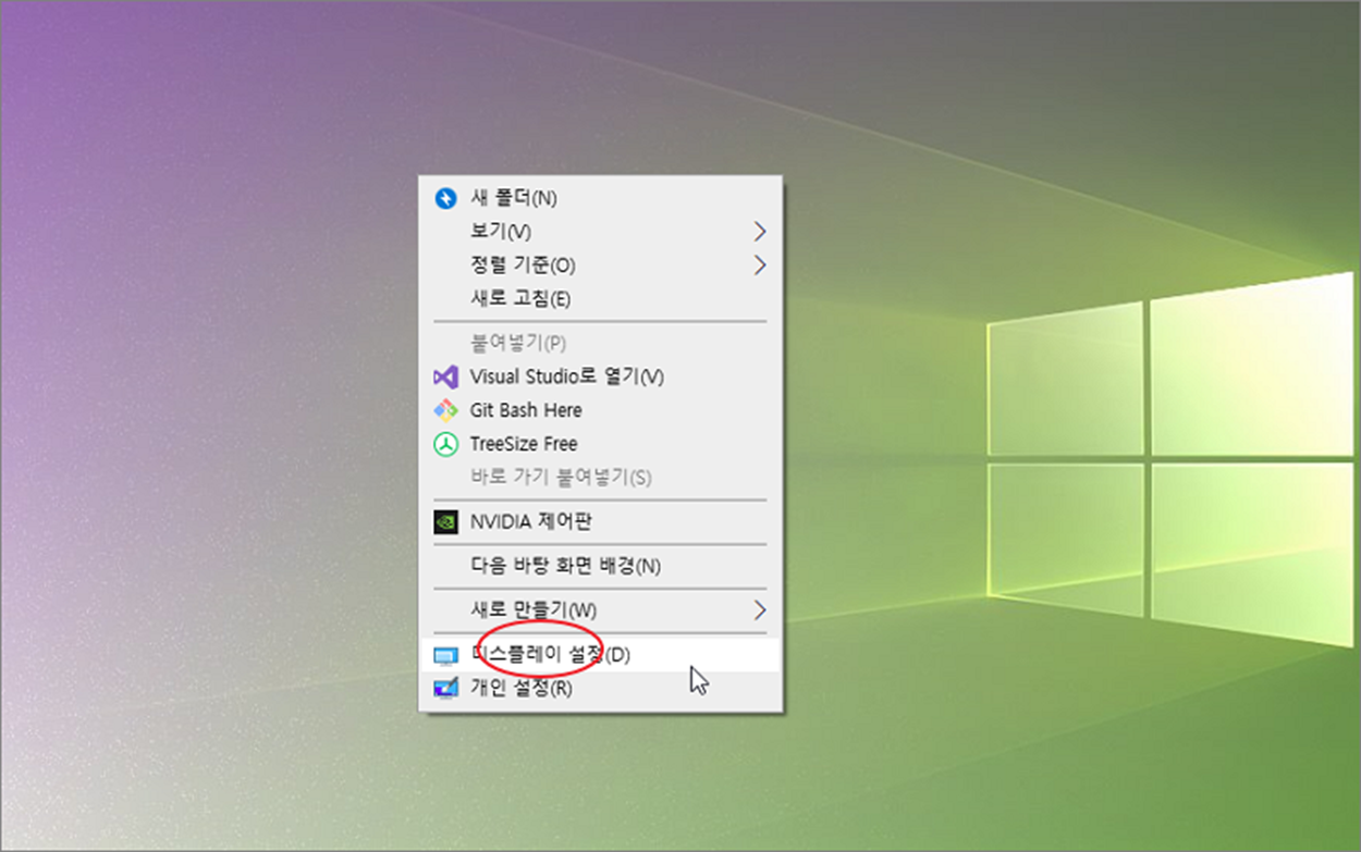 ▼ 해상도 조절을 위해서 바탕 화면에 오른 마우스를 눌러 단축 메뉴를 띄웁니다. 그리고 단축 메뉴 중 [디스플레이 설정]을 선택합니다.