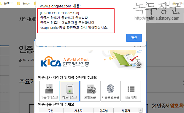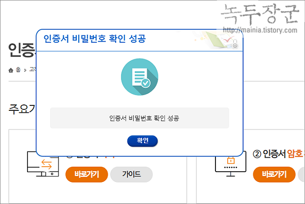 ▼ 인증서 암호확인을 눌러 공인인증서 확인 팝업창을 띄웁니다. 목록에서 인증서를 선택하고 어렴풋이 기억나는 비밀번호를 입력합니다. 이곳에서는 은행과 달리 여러 번 시도해 볼 수 있습니다.