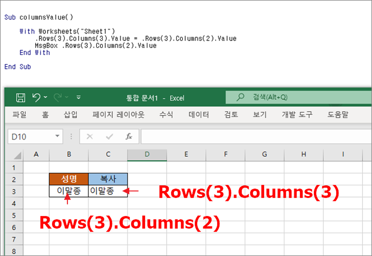 ▼ 다섯번 째는 Rows 함수와 Columns 함수로 행과 열 값을 지정하는 방식입니다. Rows 값으로 행의 위치를 지정하고 지정한 행에서 다시 Columns 함수로 열을 지정합니다. Rows(6).Columns(1).Value 는 6번째 행에서 1번째 A열의 값을 나타내는 것입니다.